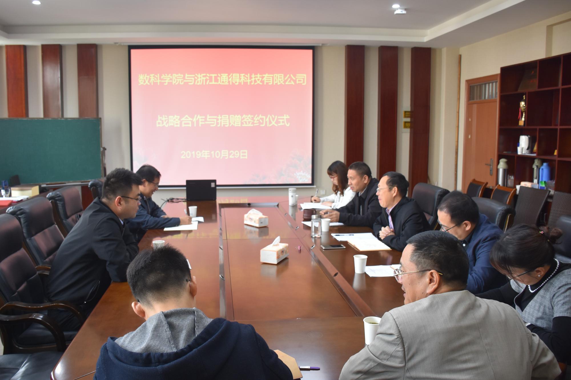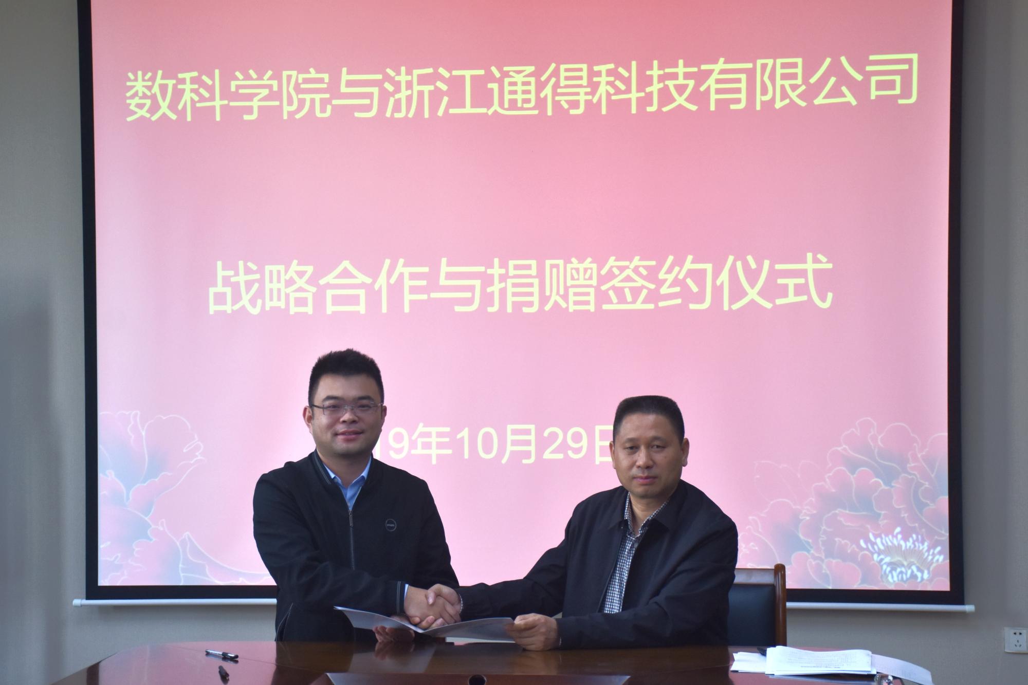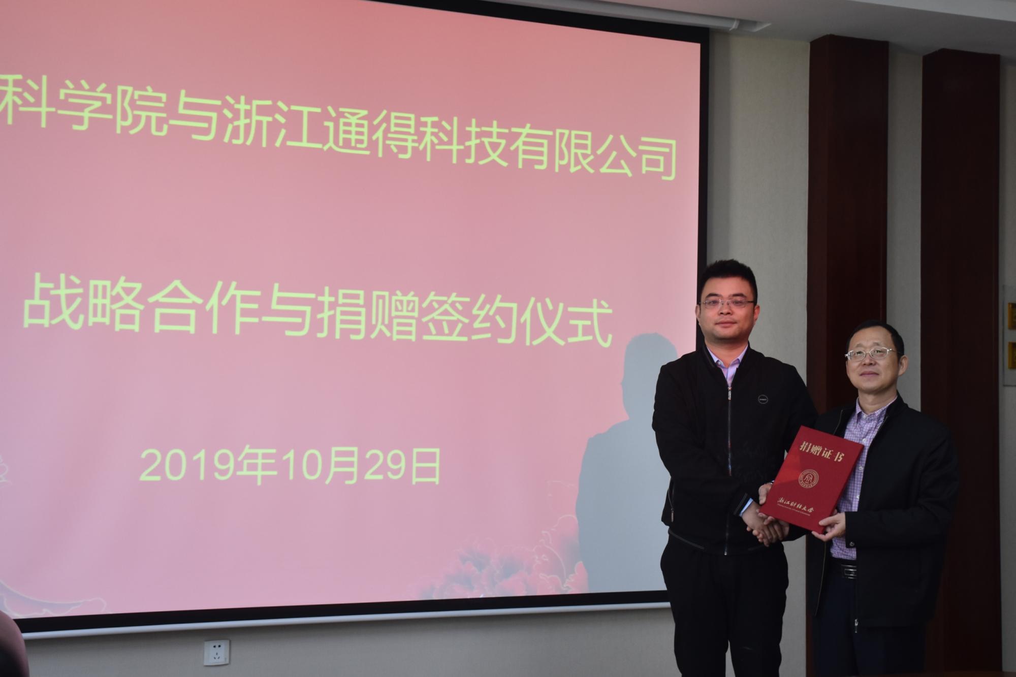 随后,通得公司总经理颜泾、禁漫岛 院长洪兴建共同签订了通得“思源”大数据发展基金合作协议书。党委书记周君兴向颜泾总经理颁发了捐赠证书。