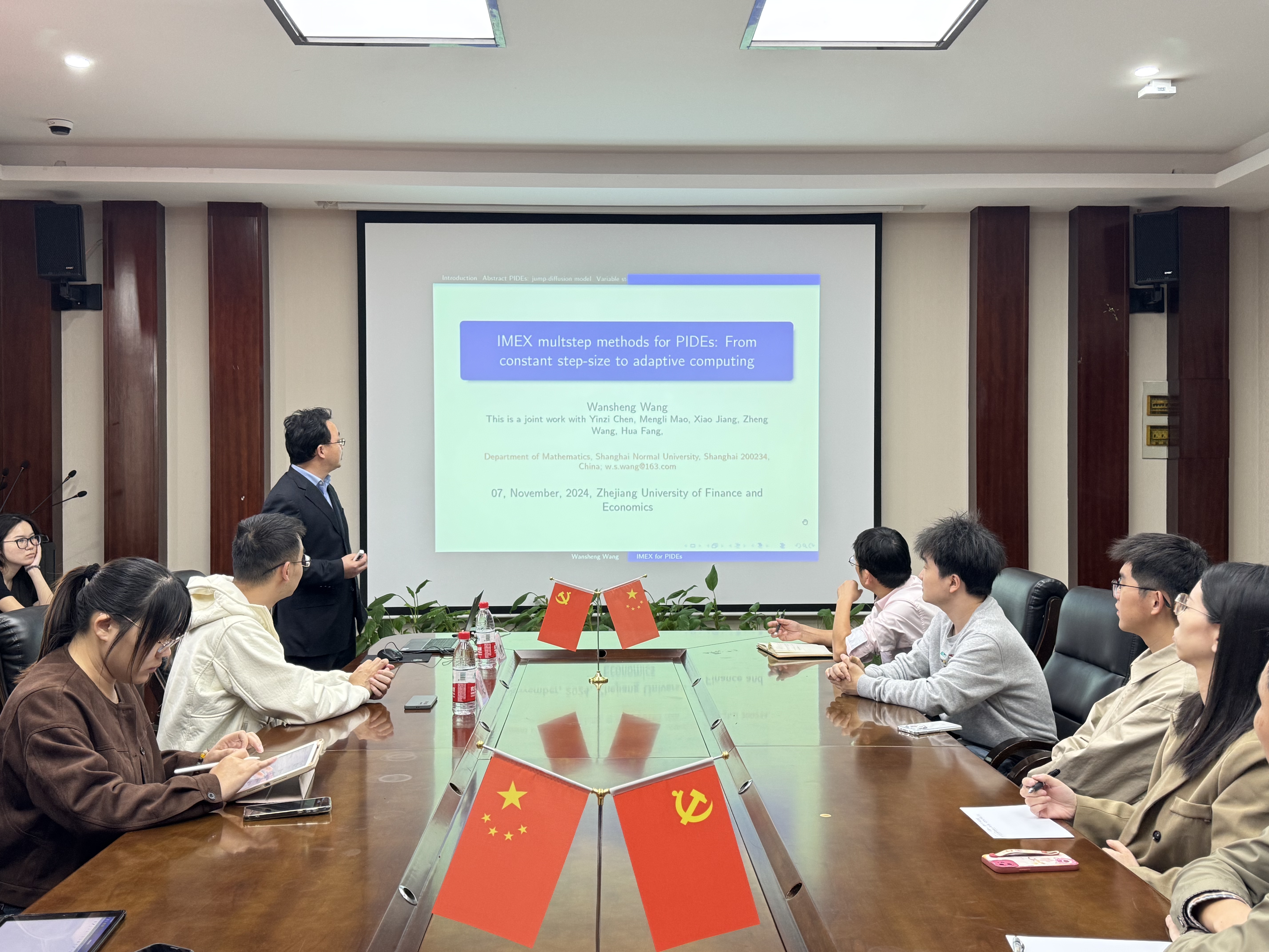 副院长王晚生教授为全院师生带来一场题为“隐显多步方法求解偏积分微分方程:从常数步长到自适应计算”的学术讲座,讲座由金融数学系系主任郑超主持,部分教师及研究生参加了此次讲座。