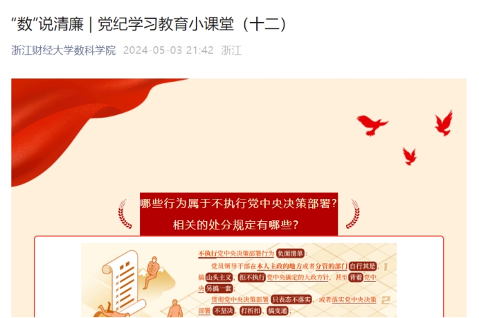 除了以专题学习卡形式开展党纪学习教育外,禁漫岛 党委依托禁漫岛 融媒体平台,持续在“数”说清廉栏目推出《党纪学习教育小课堂》系列文章,以问答形式,每天带领师生党员学习一个《条例》相关知识点。
