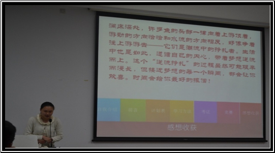 最后,由王乐乐通过《大学快跑》的视频以及她自己做的PPT推翻了之前新生们对于大学的美好幻想。大学的轻松与否,取决于我们自己。对于某些同学,大学可能是轻松自由的,没有学习,只有堕落。然而,青春的我们,应该决不甘于庸碌,决不松懈沉沦。