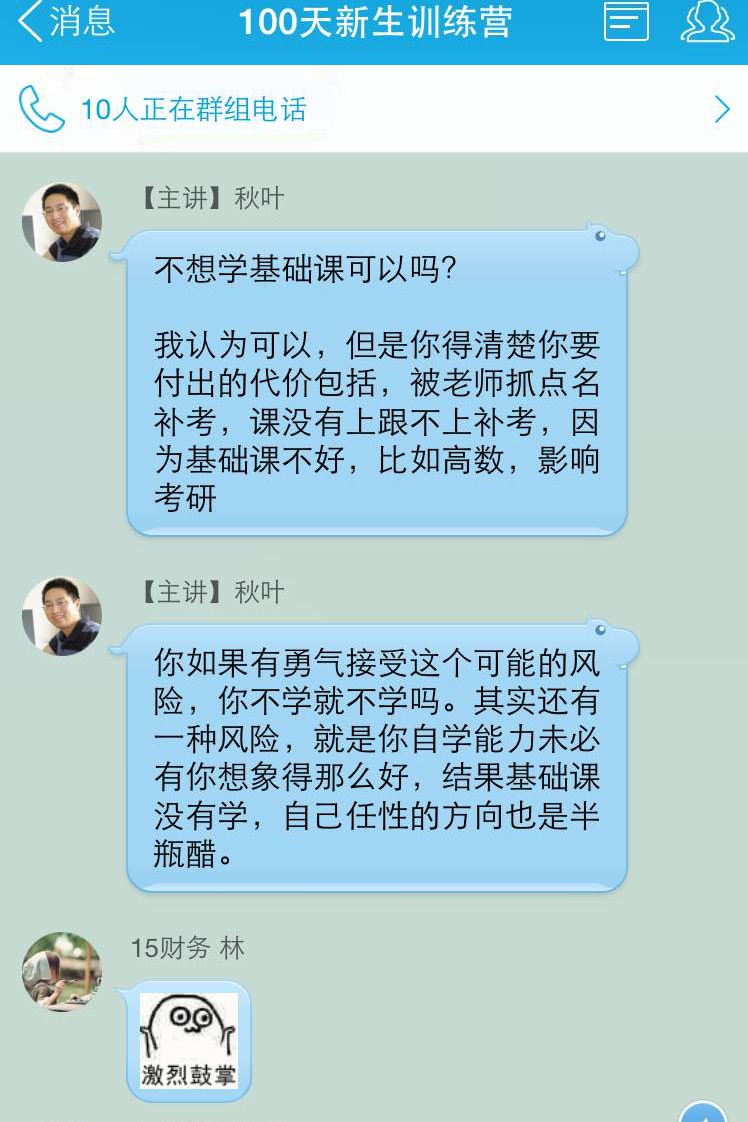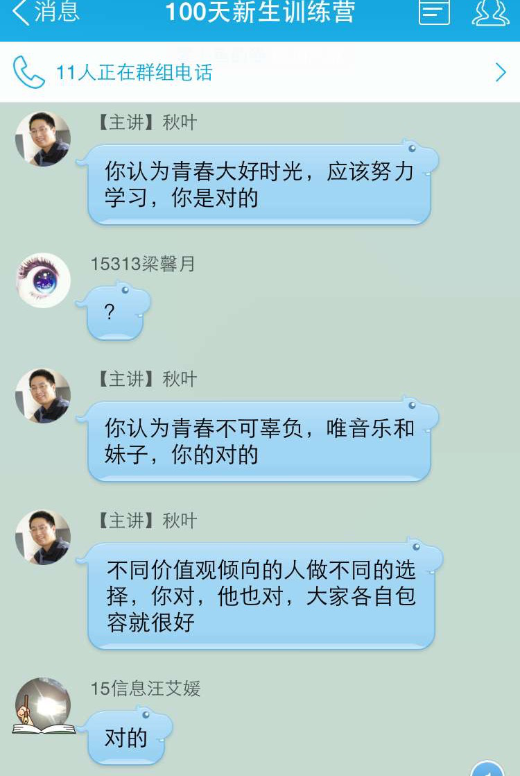 张志老师网络人称“秋叶”,上海卓弈企业管理咨询公司首席讲师、专栏作家、畅销书作者,微博@秋叶26万粉丝,微信PPT100全国40万订阅,微信秋夜青语超10万大学生关注,他的微信被称为“大学生最值得关注的10个微信之一”。在本次分享会的地点有些特别,是在“100天改变自己新生训练营”QQ群进行,他采用文字与语音相结合的方式,给同学们带来了别开生面的重要一课。