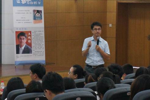 王鹏程老师是著名的培训师、生涯教练和畅销书作家,他以自身经历感化鼓舞学生,让在追梦途中艰难前行的学子感受榜样的力量。王老师的演讲共分三个部分。第一部分讲述自己大学毕业后的艰辛历程,在困难面前告诉自己“挺住”!第二部分则是探索优势,接近梦想的过程,其中王老师主要教给大家如何去寻找自身优势,从而选择合适的职业。第三部分为大家展示了“生命四环”的建立。如何将身体、心智、社交和情感以及精神这四方面构建联系,保持平衡。王鹏程老师在演讲中,以自身为例,又配以视频诗歌等形式的展示,使“让梦想为你转身”这一主题更加贴近广大学生。同学们对本场演讲报以极大兴趣,整个报告厅座无虚席,大家响应热烈,积极参与进整场演讲。