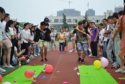 “奔跑吧,班级”共分为两个比赛项目,分别是趣味4*100和拔河,皆以班级为单位参加。趣味4*100游戏是由每班出八个人,四组男女接力完成的。游戏开始了,班级派出男女同学就位之后,男同学在肩背本班女生的同时戴上眼罩,在女同学的指挥下绕过障碍扎破气球,并完成原地转圈与男女组合跳绳,用时最短者获胜。在第一个活动中,各班男女同学可谓是八仙过海各显神通,使出浑身解数以最快速度到达终点,场面十分精彩。有的参赛同学在比赛过程中失误出糗,引起了观众们欢乐的笑声。