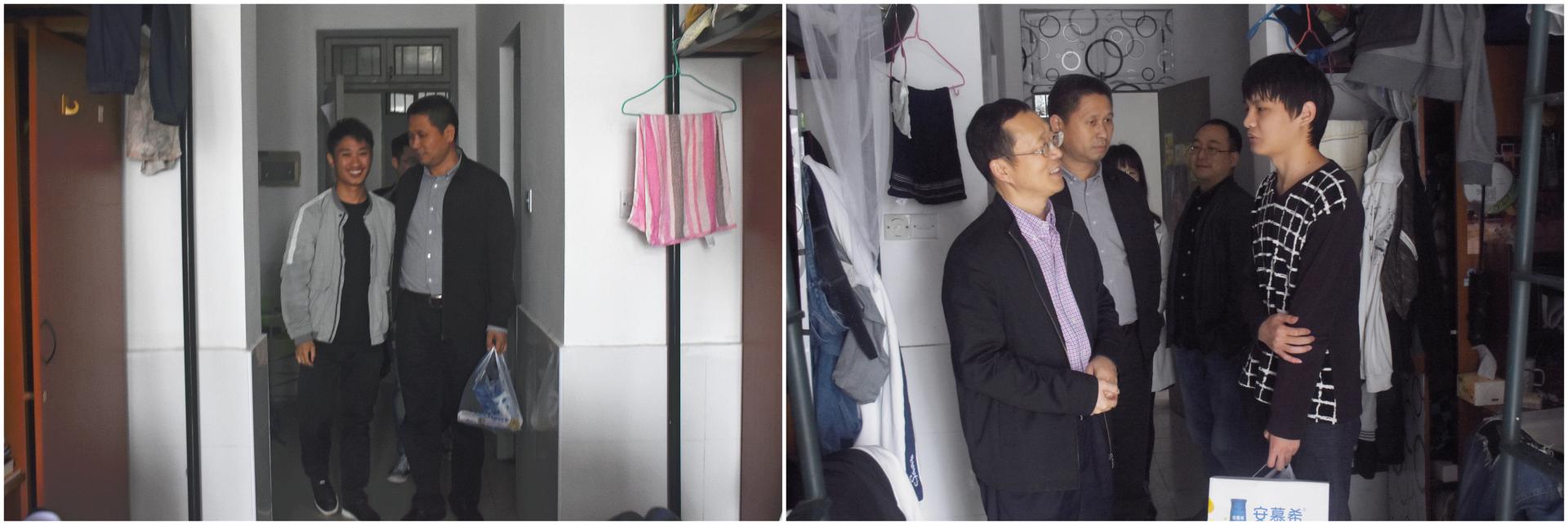 院长洪兴建、党委书记周君兴、副院长周银香、党委副书记刘向前冒雨走访了部分学生宿舍,亲切询问同学们的学习生活情况,给同学们带去了日用品和食品。辅导员江挺、蒋萌陪同走访。