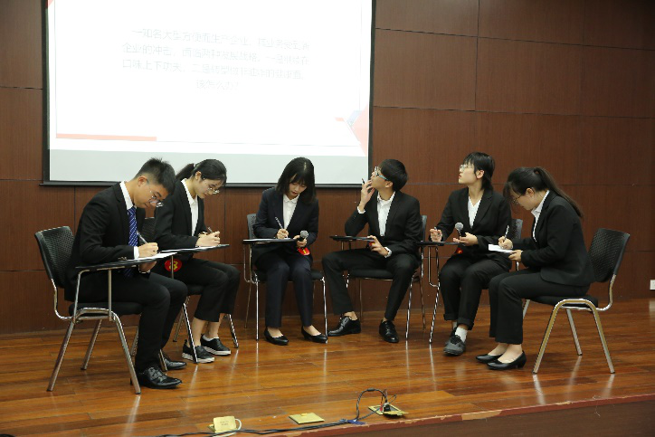 随后进行的是无领导小组讨论环节。这一环节也是本届比赛的新环节,突出考量了选手的组织能力、团队协作能力、分析能力等。在选手们对赛题的独立思考、协作分析后,由一位代表对赛题进行了总结发言。评委也对选手们的表现进行了一番点评,比赛现场气氛十分热烈。