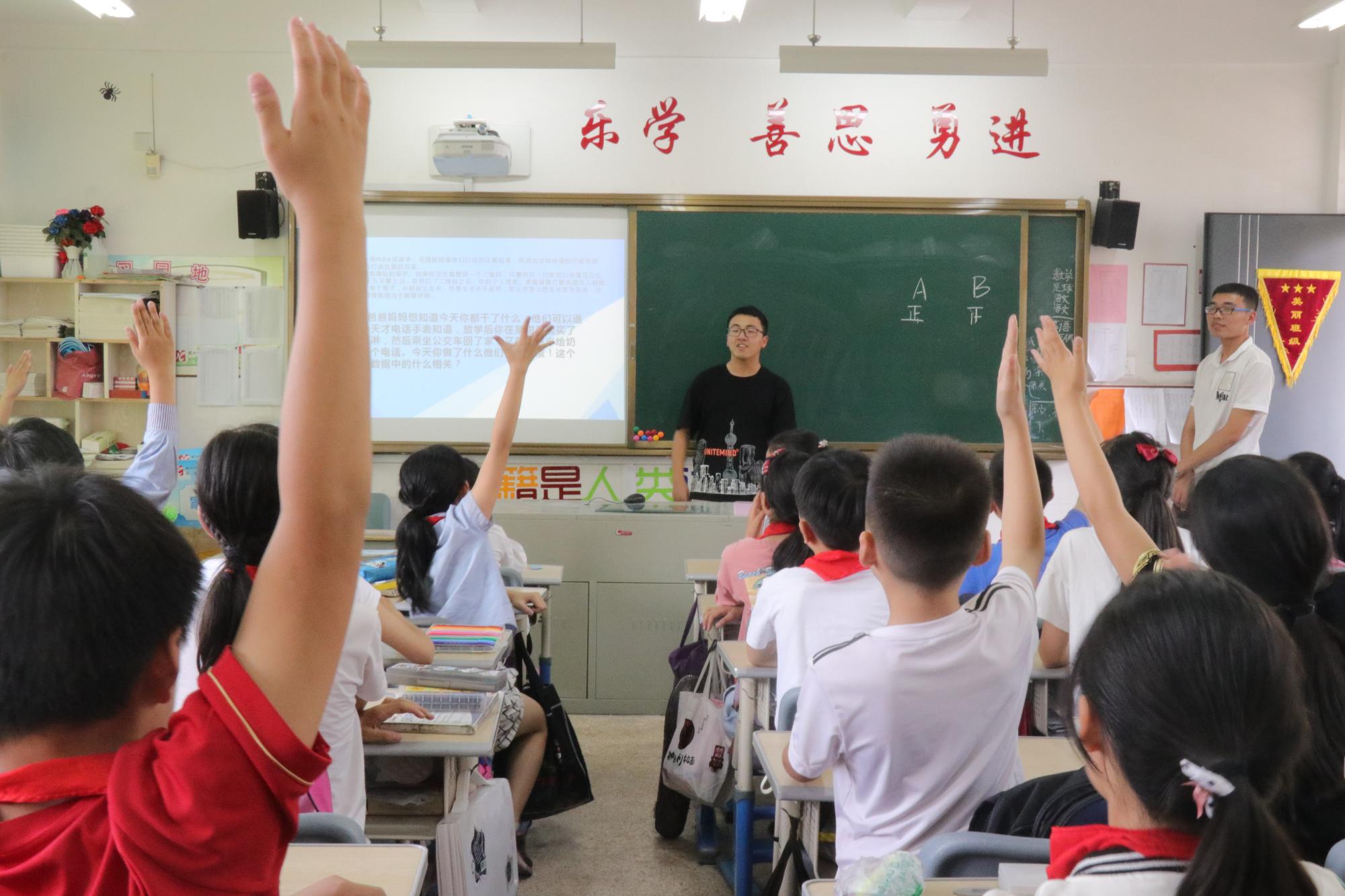在讲解之后,是紧张的趣味竞答环节。全班同学分为两组抢答。问题不但涉及视频和讲解中提到的知识,还触及到了大数据在智慧城市中的其他表现与运用。在大学生们的引导下,小学生们凭借日常观察和广泛阅读,将难题一一答出,使得竞答环节更加激烈有趣,直到游戏结束,同学们还都意犹未尽。最后,大学生们给获胜的队伍颁发了小奖品。
