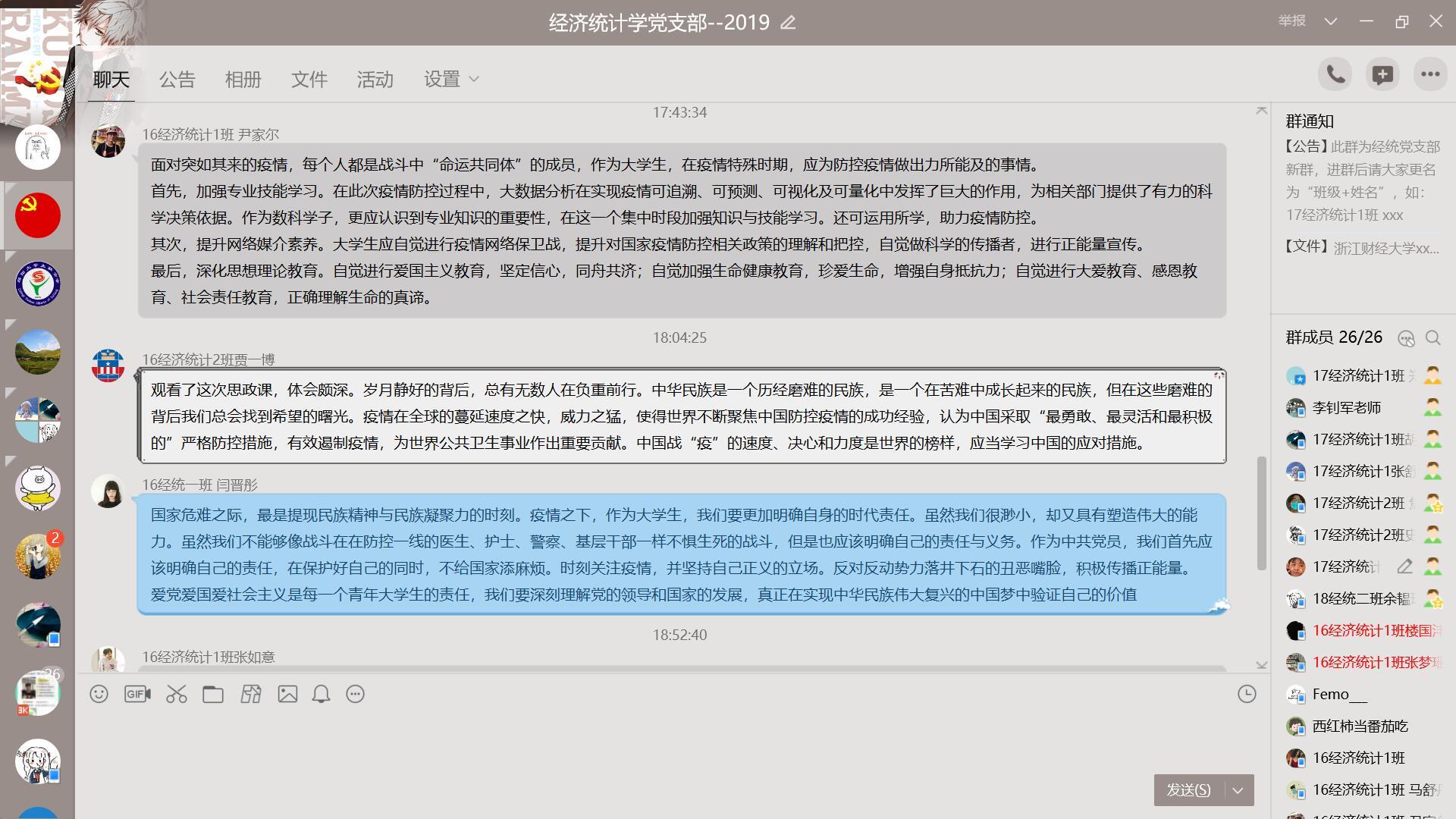 共6个支部、23个班级,900余名师生共同观看了思政大课堂。观看结束之后,研究生党支部以《发挥制度优势,坚决打赢疫情防控战》为主题开展了线上讨论,大家多方位剖析了当前国家应急管理制度、医疗保障制度等在这场疫情防控中发挥的作用,深入讨论了如何继续发挥制度优势,彻底打赢疫情防控战。经济统计本科生党支部以《逆行青春》为主题,分享了疫情防控战中许多青年的优秀事迹,讨论了如何提高大学生的社会责任感和爱国主义精神。应用统计本科生党支部以《战“疫”家书》为主题,收集了在这场人民战争中医务人员、社区工作者、志愿者等以各种形式书写的家书,讨论了这些家书中体现的中国精神。数学系本科生党支部则以《关于抗击疫情中的中国数据》为主题,整理了抗击疫情过程中的相关图表、动态数据分析视频等,以数据为有力证据,证明了中国在抗击疫情过程中的巨大投入,以及科学防控的效果。禁漫岛