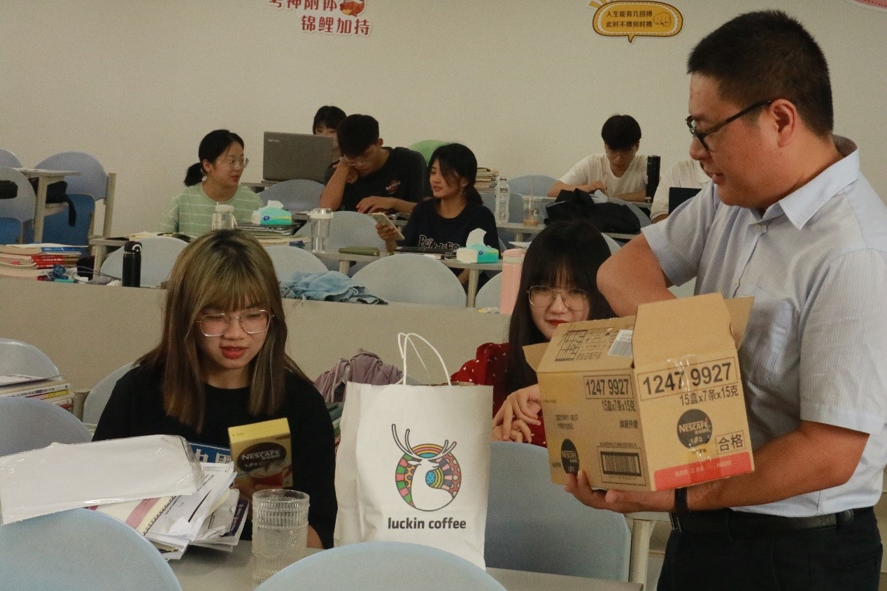 谈话过后,三位领导及辅导员向同学们分发了牛奶、咖啡礼物,并合影留念,为枯燥的考研征程上增添一份温暖。青春是无悔的奋斗、是笔下的耕耘,祝愿所有考研学子都能成功上岸、金榜题名。