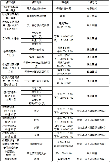 2.核心方法课和申论预测为线上直播,冲刺特训课、全真模拟考和面试均为班级群通知的校内上课。参加课程的同学请认真完成相关作业,积极配合教师工作。