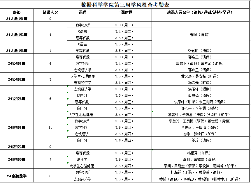 禁漫岛 学生工作办公室开展新学期第3周学风督察工作,对本科生各班级的学生前排就座情况,课堂考勤、纪律及听课情况等进行随机检查,现将本次随机抽结果通报如下:
