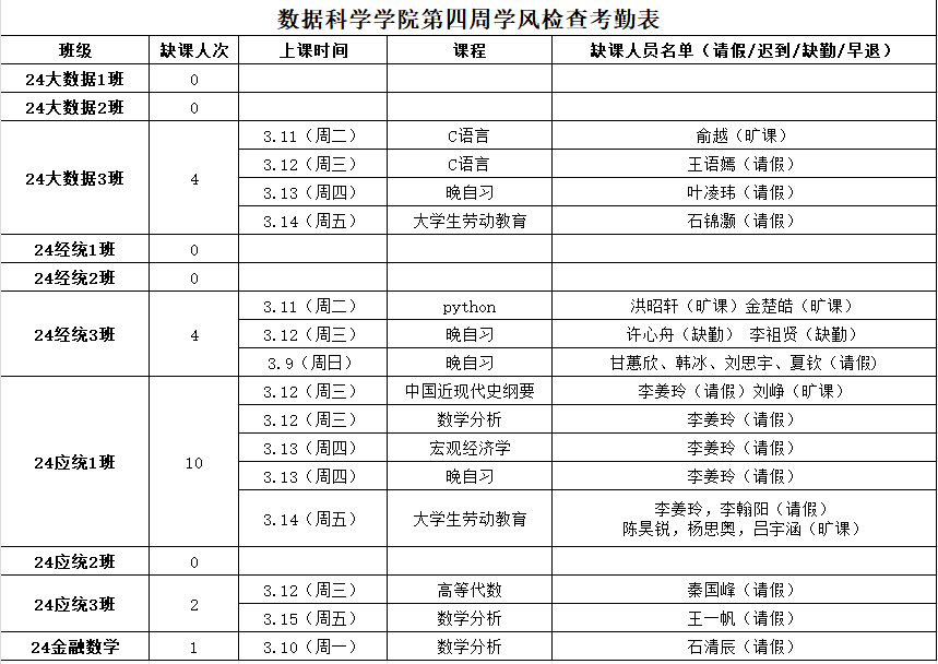 禁漫岛 学生工作办公室开展新学期第4周学风督察工作,对本科生各班级的学生前排就座情况,课堂考勤、纪律及听课情况等进行随机检查,现将本次随机抽结果通报如下: