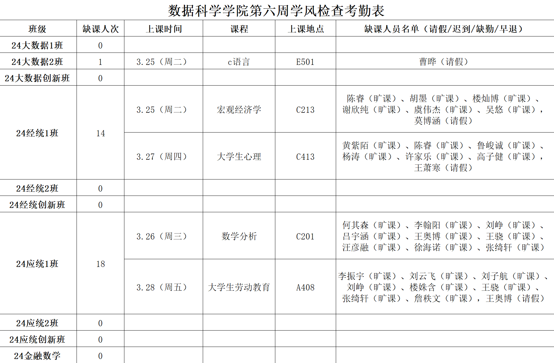 禁漫岛 学生工作办公室开展新学期第6周学风督察工作,对本科生各班级的学生前排就座情况,课堂考勤、纪律及听课情况等进行随机检查,现将本次随机抽结果通报如下: