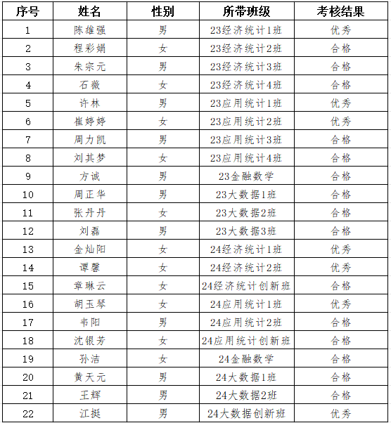 量化评分等程序,确定考核为“优秀”等次7人、“合格”等次15人。现将班主任工作考核优秀等次、合格等次人员名单予以公示,详见如下: