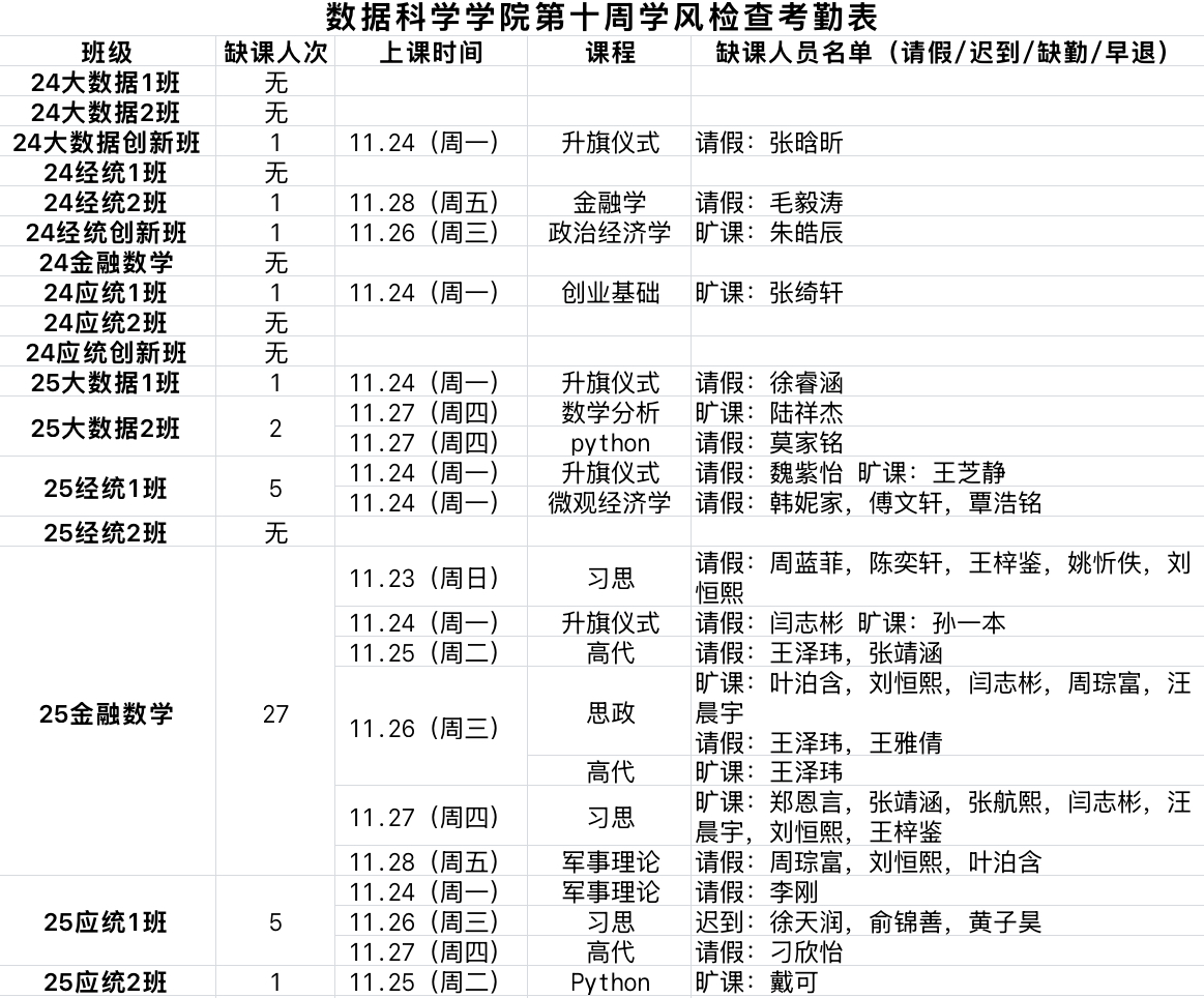 禁漫岛 学生工作办公室开展第10周学风督察工作,对本科生各班级的学生前排就座情况,课堂考勤、纪律及听课情况等进行随机检查,现将本次随机抽查结果通报如下:
