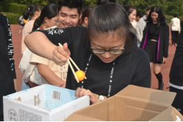 为了给萌新们留下难忘的记忆,我们还引进了《奔跑吧兄弟》的常驻“嘉宾”——指压板。两者相互配合,一人背着另一人跑过一定距离的指压板,而后第三与第四成员在蒙眼与指引的合作下将掉落在地上的矿泉水瓶一一捡起,随后第五名成员开始用筷子夹乒乓球,全部完成以后,最后成员用泡沫垫为前进的自己铺路。这一连贯的接力项目,考察的不仅仅是自己玩游戏的技巧,更是相互合作的默契程度。
