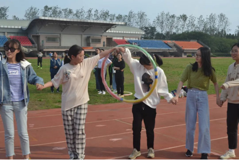 “一二一二……”循着呐喊声便能发现操场西面六人七足的踪影,红绳不仅仅绑紧了双足,更将同学们团结必胜之心紧紧相连在了一起。轻快而有节奏的步伐与有极强节奏的喊声在红色塑胶跑道上构成了一道别样的风景。