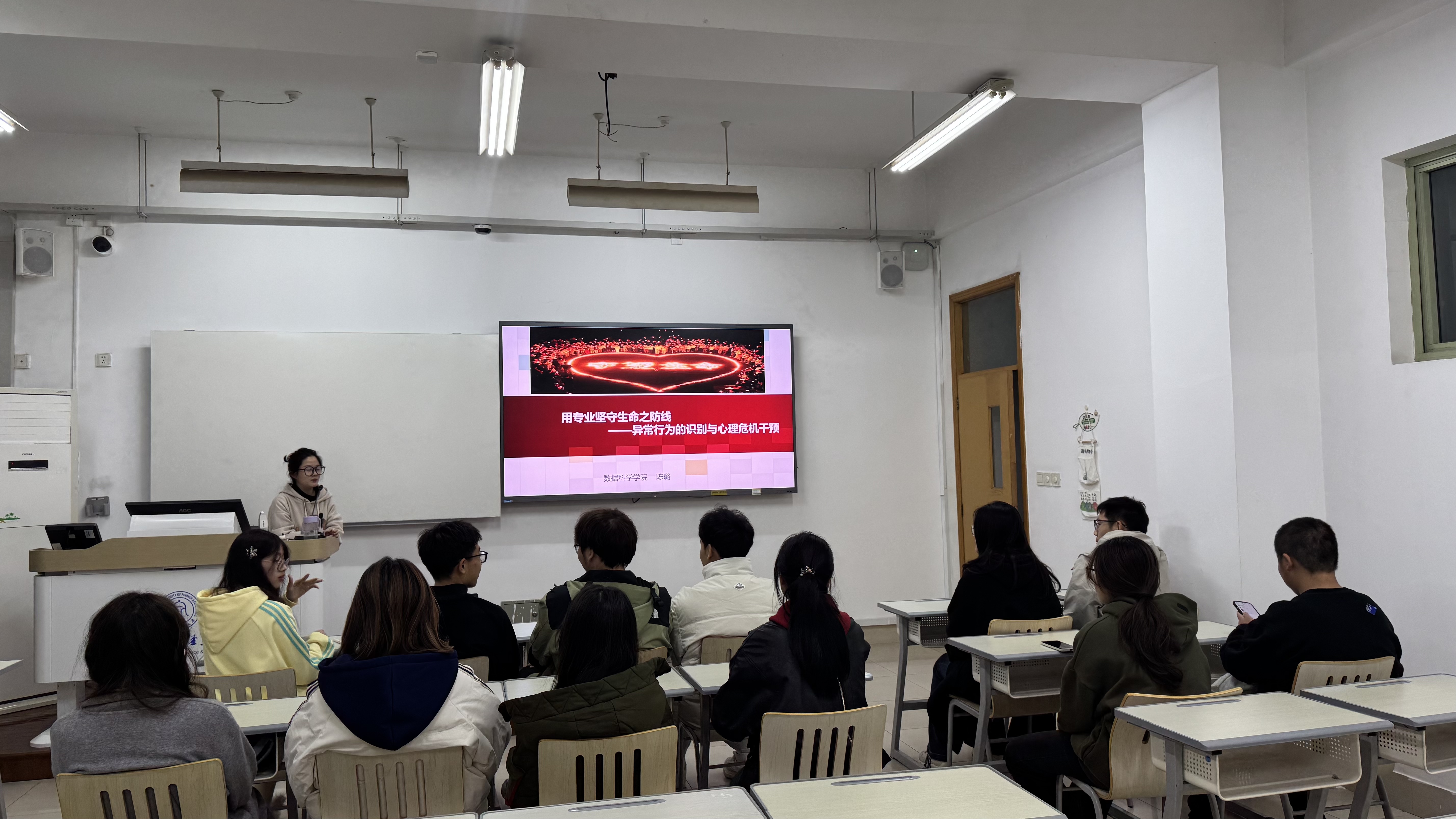 陈璐以正常与异常行为的区分引入,对抑郁症等常见精神疾病进行剖析,涵盖症状、成因及影响等维度,使同学们对这类疾病形成系统认知,以便日后精准识别与理解患病同学状况。本次培训着重阐述心理委员职责——发现危机并及时报告,详细说明危机信号识别与报告规范流程,确保心理委员在面对突发状况时能有条不紊地应对,为后续专业干预筑牢基础。