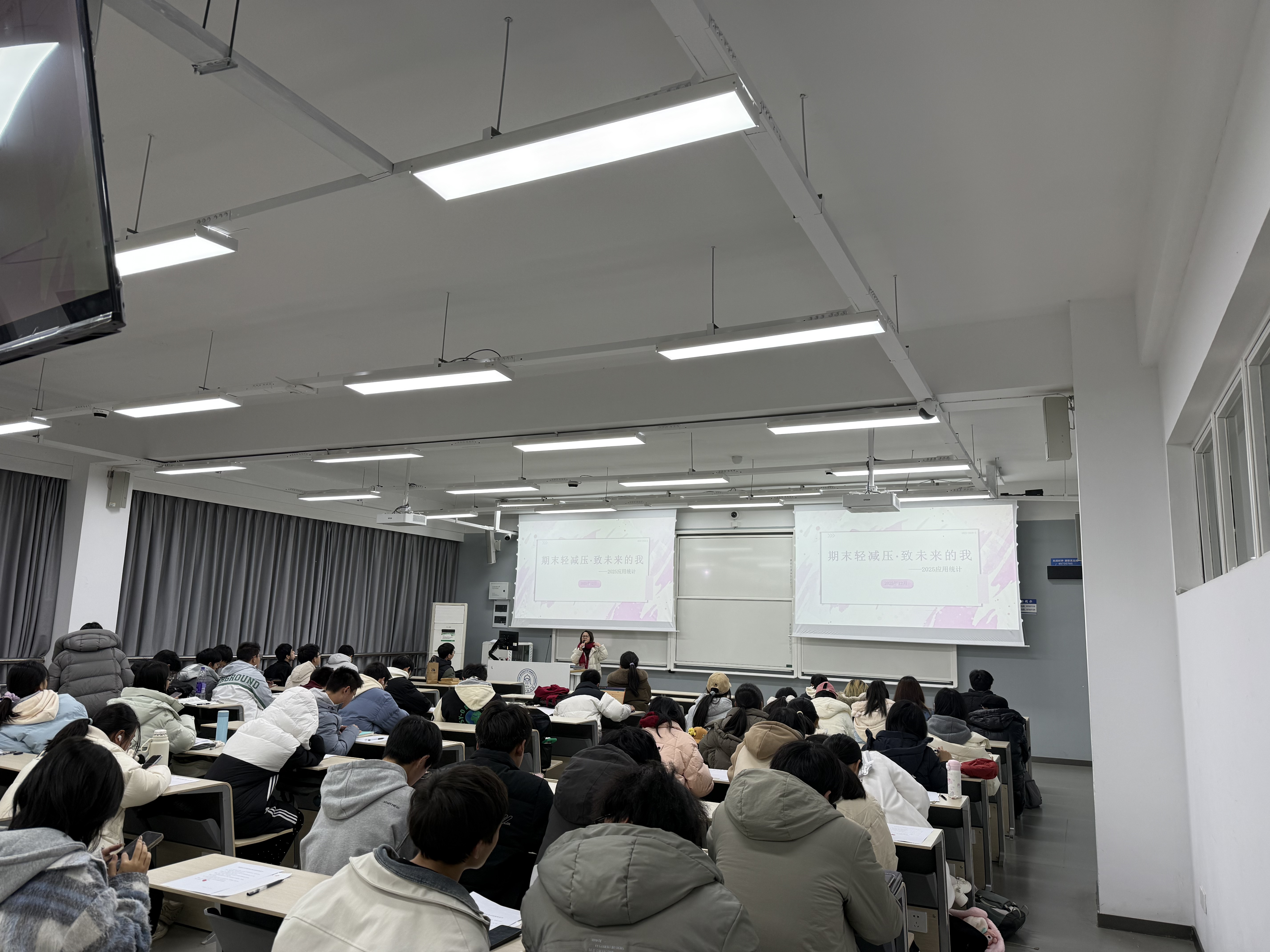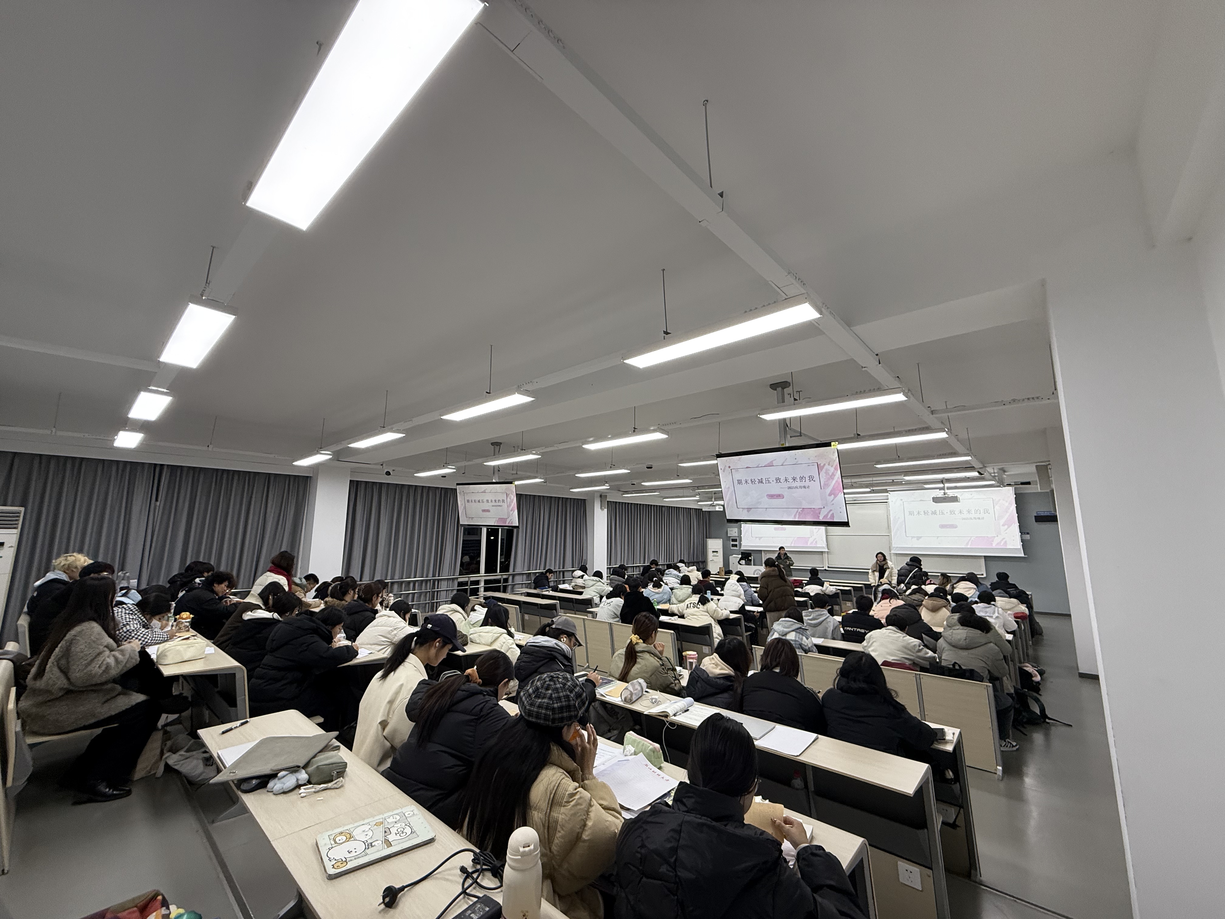 新生各班于晚自习教室同步开展“期末‘轻’减压·致未来的我”心理主题班会。各班辅导员、班主任共同参与并指导班会开展。